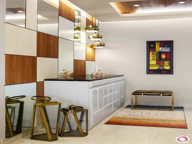 In spite of the fact that negligibly brightened, this hall accomplishes a parcel to back the insides plan of this 4BHK flat in Gurgaon. With its exuberant backdrop, it presents the tone of the living room interior. And with its mechanical pendant lights, it exhibits fashion and opulence.